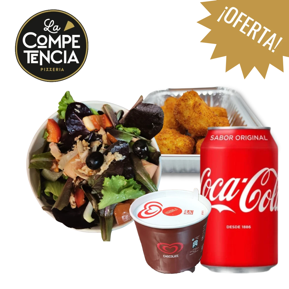 Espaguetis a elegir o ensalada mixta/marinera + complemento (croquetas o pechuga de pollo) + refresco 33cL + postre